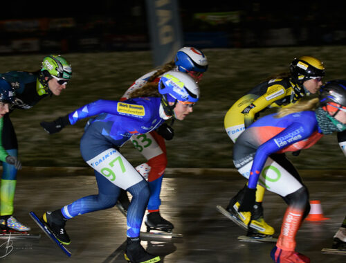 Sanne reed zeer sterk en kreeg steeds meer vertrouwen en liet zich diverse keren goed zien voorin het peloton. Helaas sloeg ook hier de pech toe en werd Sanne na 27 ronden door een andere rijdster hard de boarding ingereden en was ook haar wedstrijd voorbij.